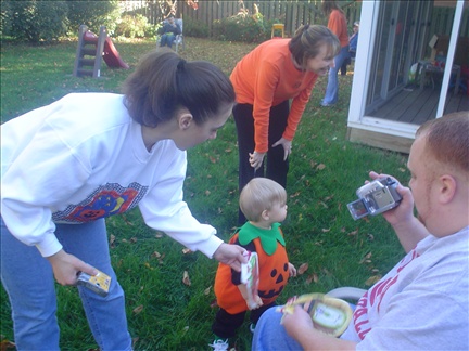 Grant hands candy to Sarah during out backyard trick-or-treat