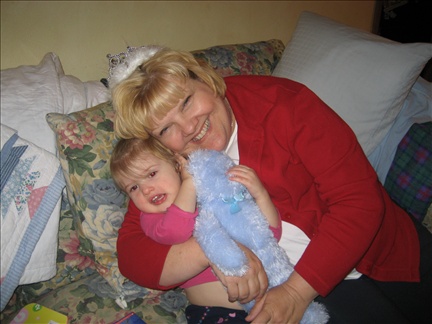 Charlotte opens gifts during a visit by Grandma, Grandpa and Uncle Dave