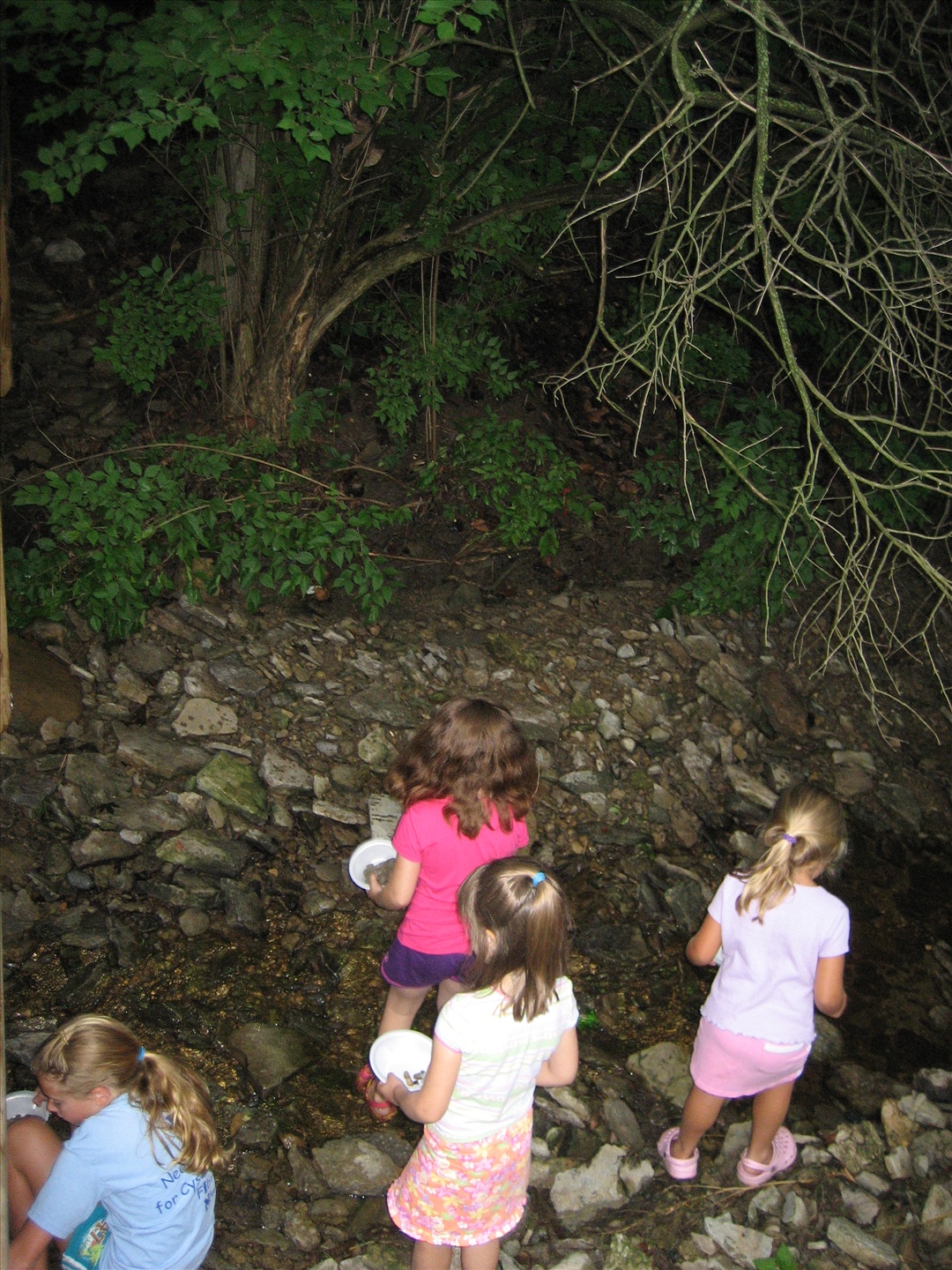 The girls scavenge for unique rocks and shells in the creek