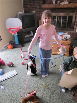Sarah walks her dogs tied to a hula hoop! Can you say PATENT?