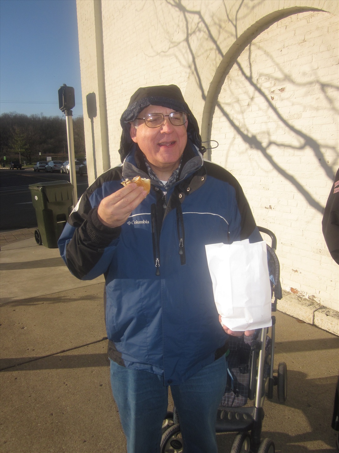 Wimpy eats his burger in the street