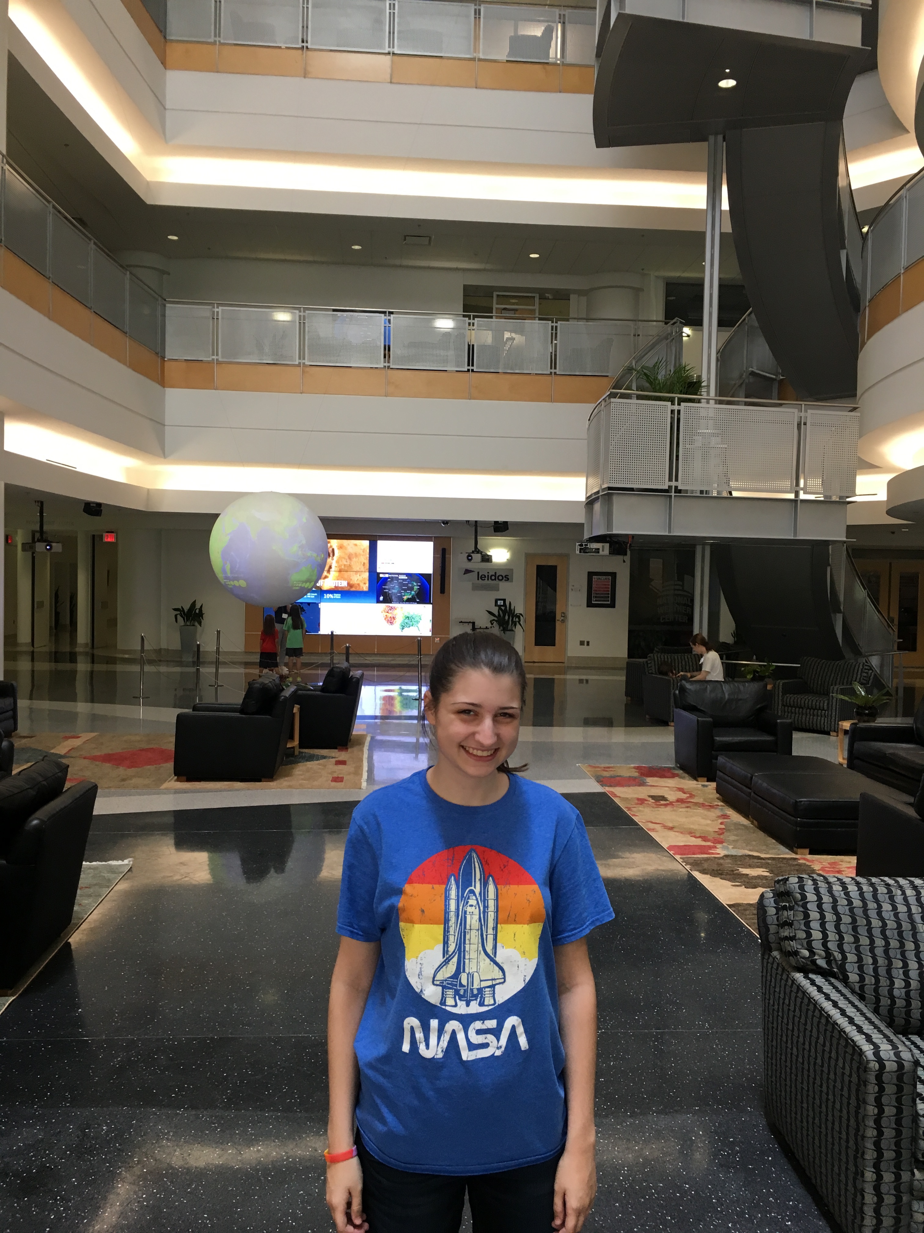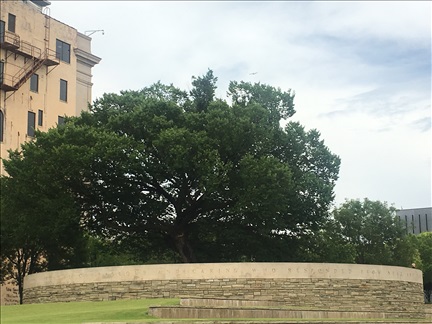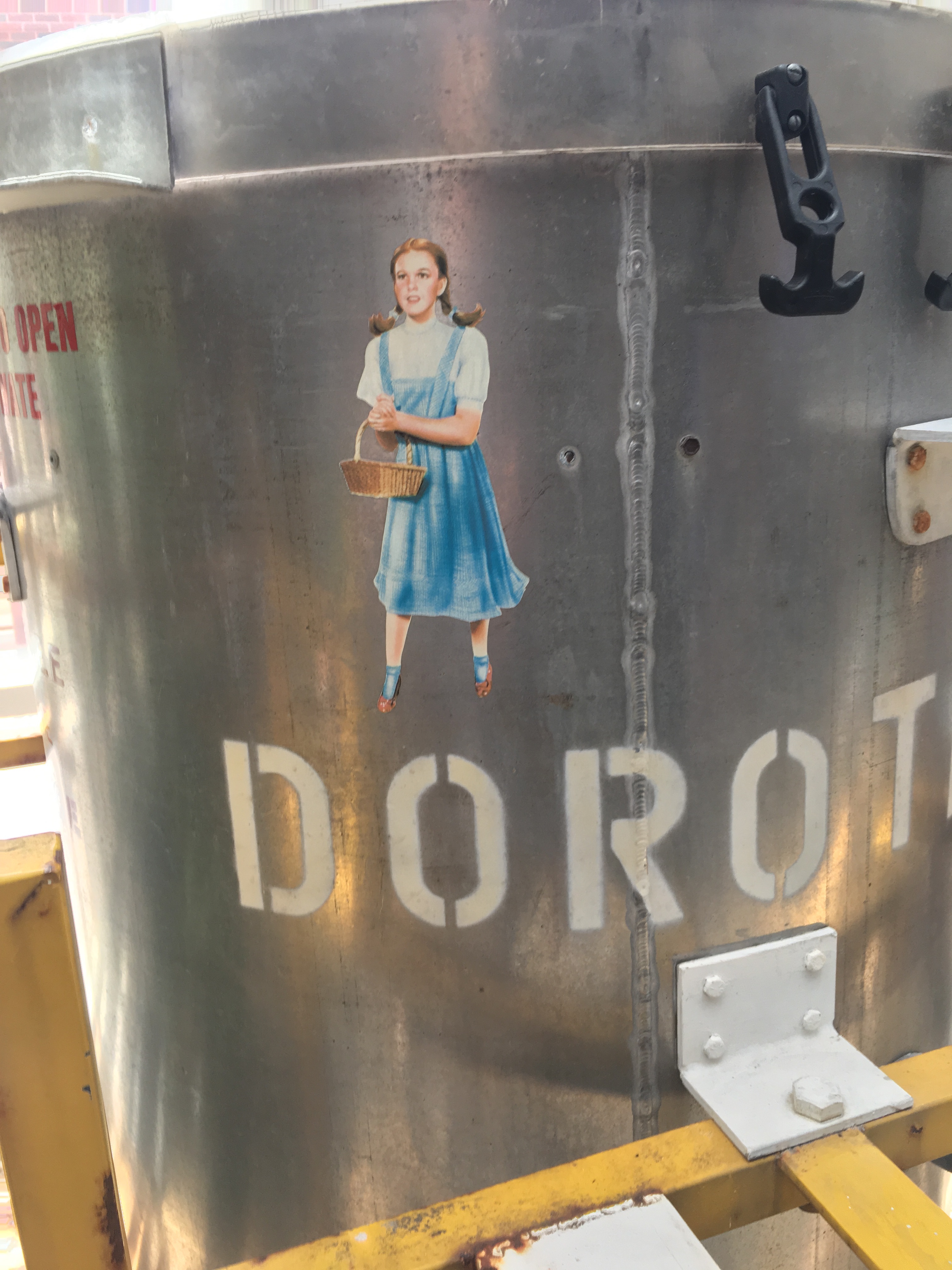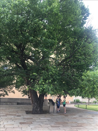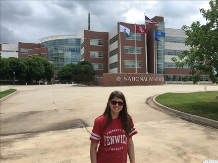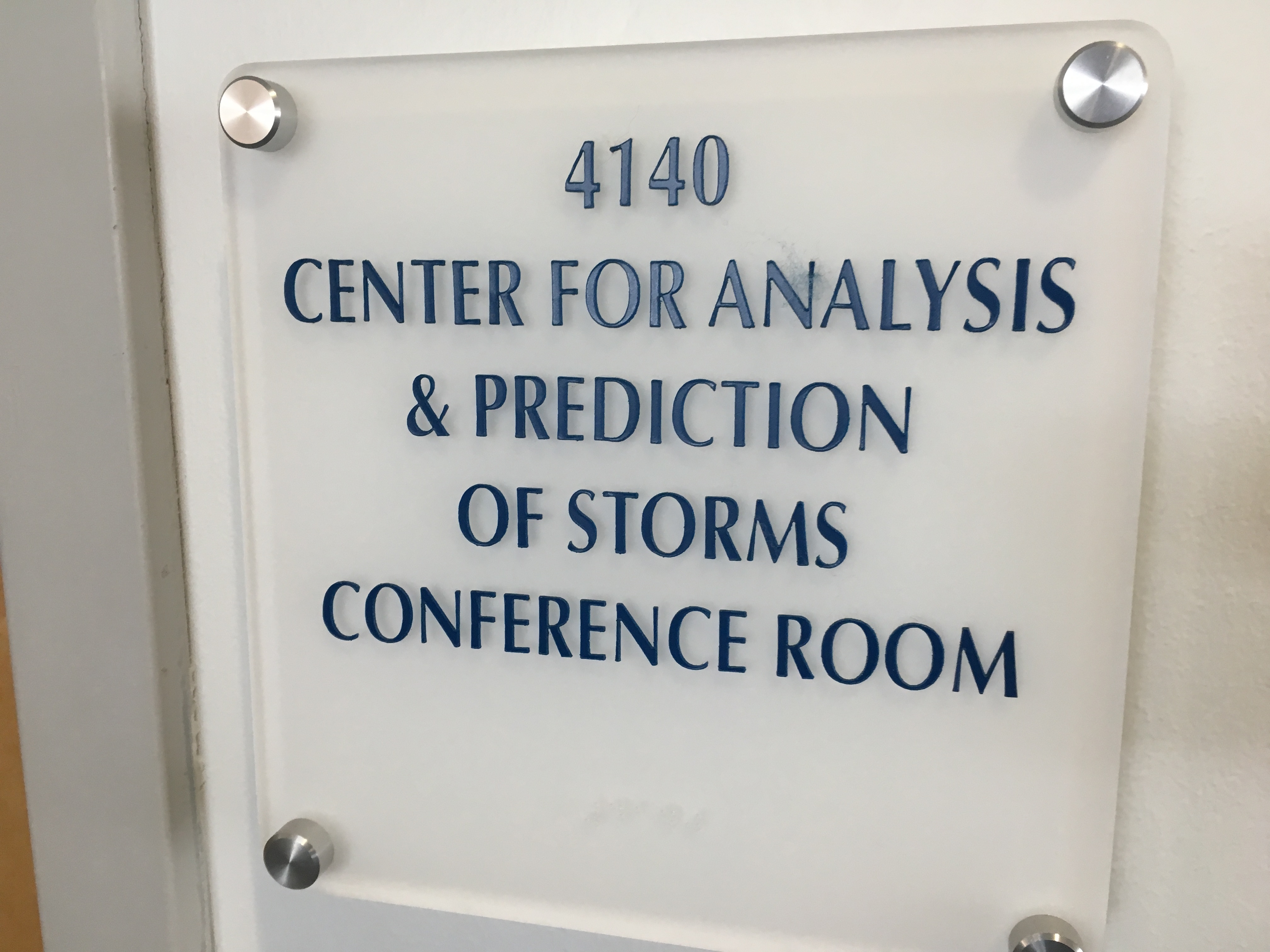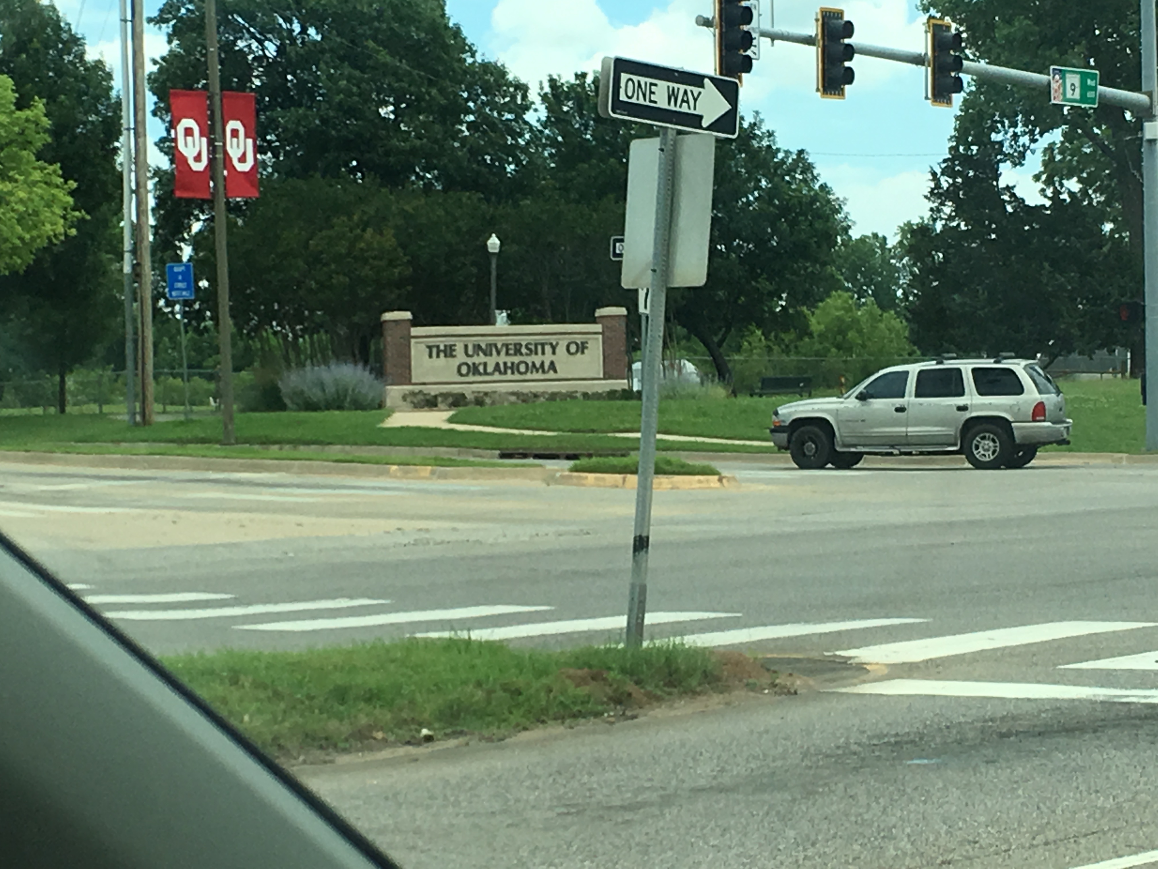 Char sits behind a sign for the Oklahoma Climatological Survey